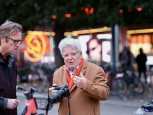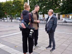 Ulf Cahn, kommunikationschef för ”Med Israel för fred” MIFF, och Ann Ringart, från Bring them home Stockholm, intervjuas av Studio Etts reporter Miranda Wretman.