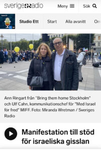 MIFF:s deltagande i manifestationen för israeliska gisslan fick under den gångna veckan stor uppmärksamhet i svenska medier. Här återger vi Sveriges Radios och TT:s intervjuer med Ulf Cahn.